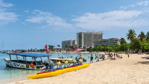 Central Ocho Rios beach with calm waters and vibrant atmosphere